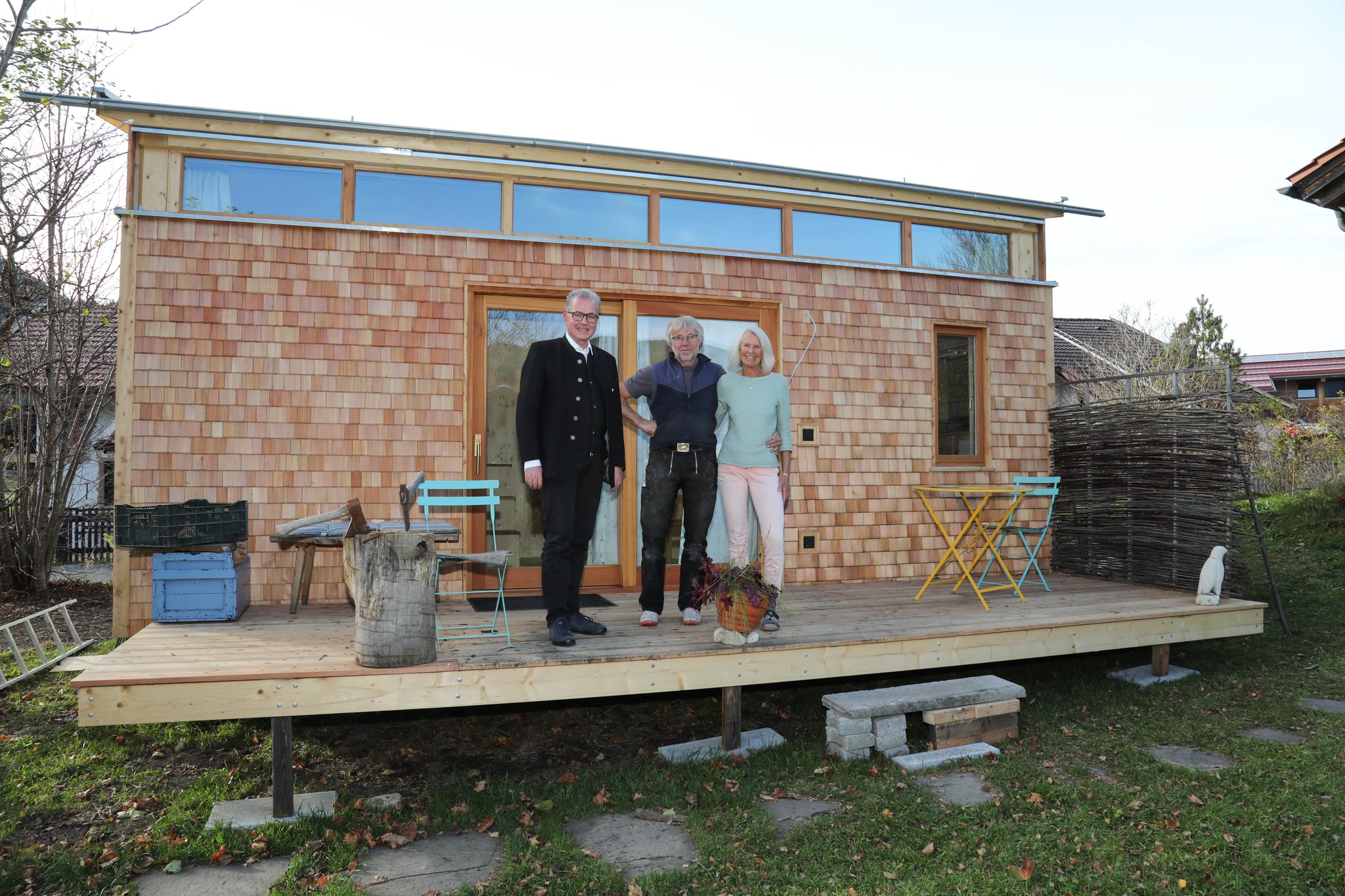 Sie sind klein, aber bieten dennoch Wohnraum für Menschen, die naturnah und klimafreundlich leben wollen. Tiny-Häuser sind nicht irgendwelche Hütten, sie sind eine vollwertige Unterkunft auf kleiner Fläche. „Es macht mich stolz, dass es Menschen wie Manuela Schädle und Bernd Klöpper gibt, die sich dem Thema Tiny-Häuser verschrieben haben. Sie leben ihren Traum“, so der Fraktionsvorsitzende Florian Streibl. Die beiden Tiny-Haus-Liebhaber produzieren in Zusammenarbeit mit einer örtlichen Zimmerei und Schreinerei und anderen regionalen Gewerken die Kleinwohnungen. Viel Wert legen die beiden auf einen ökologischen Aufbau der Häuser, deshalb besteht ein Großteil des Hauses aus Holz. „Die Tiny-Häuser stehen den normalen Holzhäusern wie wir sie kennen in nichts nach“, so Klöpper. Sie werden je nach Kundenwunsch individuell in Unterammergau produziert. Die Haltbarkeit der Häuser beziffert Klöpper auf rund 100 Jahre, wenn man sie pflegt. Bei der Aufstellung der Häuser entfällt die Bodenversiegelung, denn sie werden punktuell auf Steinfundamente gestellt. Die restliche Fläche unter dem Haus bleibt frei. Eine Terrasse mit einem kleinen Vordach bieten weiteren Platz. Für den Abgeordneten Florian Streibl war es ein besonderes Erlebnis, dass er sich ein persönliches Bild in einem Tiny-Haus verschaffen konnte. Er ist sich sicher, dies wird eine neue Art zu wohnen. Diese Wohnart kann die Antwort auf den Wohnungsmangel sein. Gerade für die Nachverdichtung im innerörtlichen Bereich bieten die Tiny-Häuser eine charmante Alternative. 09.11.2022, Foto: Dominik Bartl