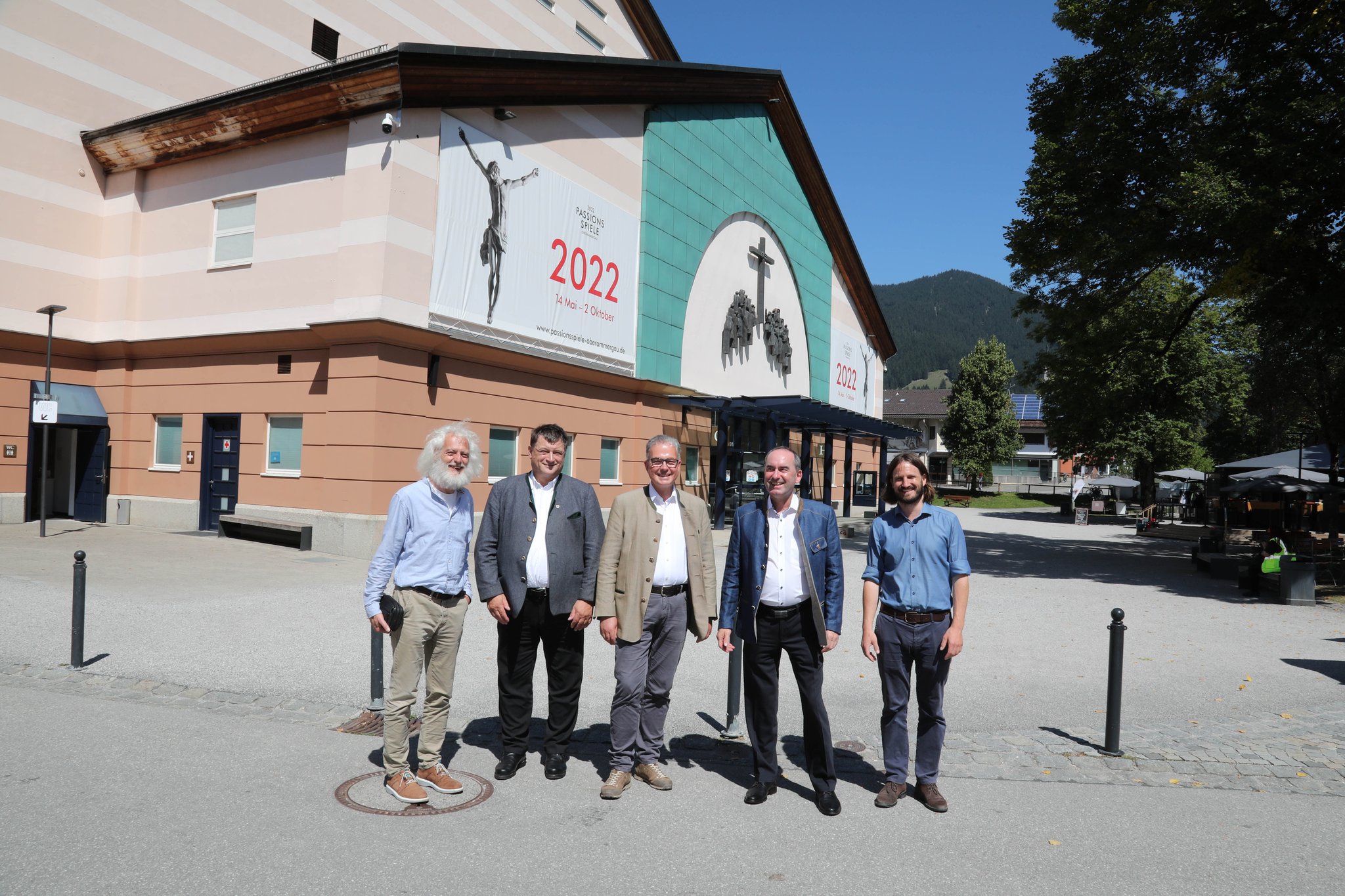 Nach der Waldbegehung ging es ins Tal, um sich mit Walter Rutz, Geschäftsführer der Passionsspiele, vor dem Passionstheater zu treffen. Dem Treffen folgten auch Landrat Anton Speer und 1.